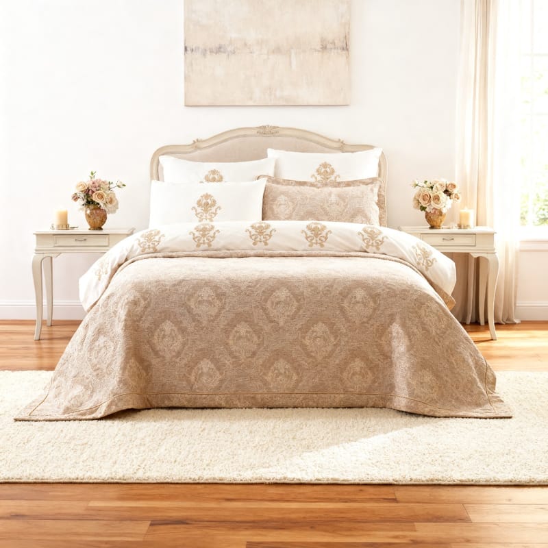 تم حياكة غطاء بيت اللحاف الخارجي والمخدات الديكورية باستخدام تقنية الجاكارد، حيث تتداخل الخيوط مع بعضها بعدة طبقات لينتج عنها تطريزات فاخرة وثابتة.