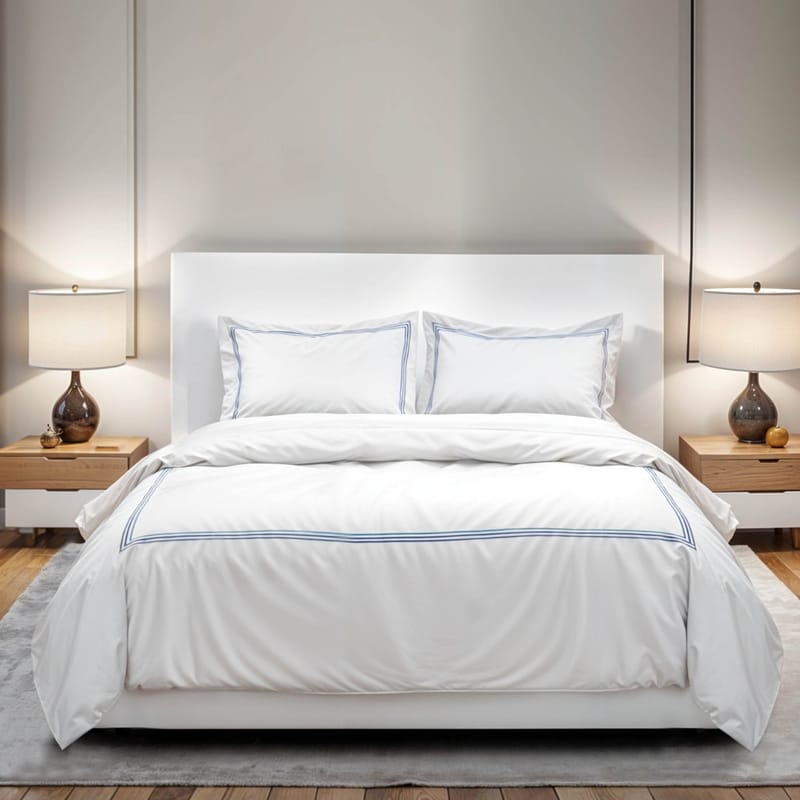 Aida is a king size cotton white hotel comforter set, adorned with a bold navy border—perfect for those who crave premium comfort, regal elegance, and distinctive modern design in their bedroom.
