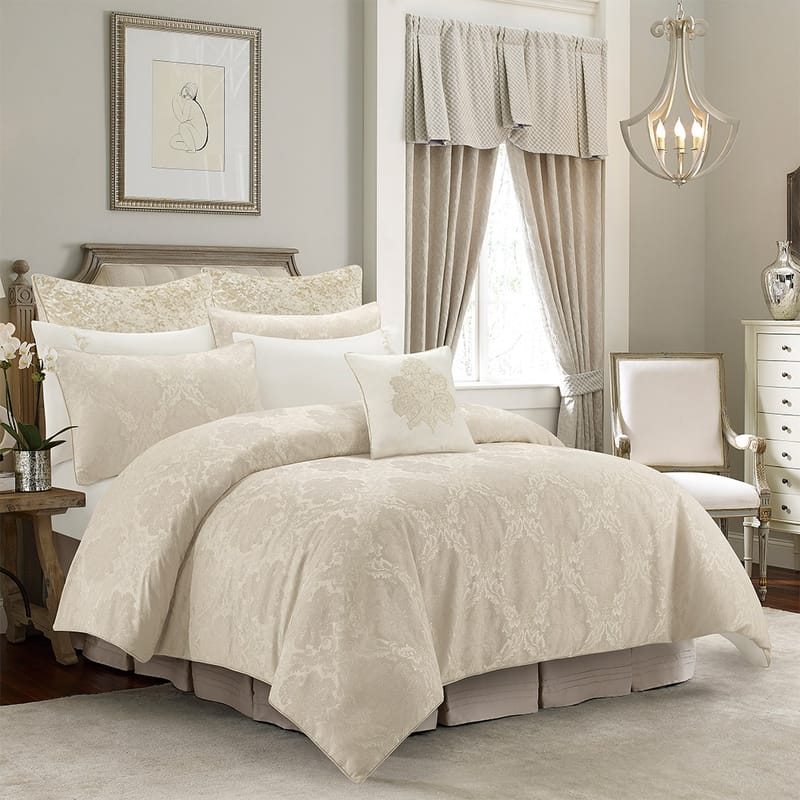 Upper Exterior Face of comforter: 100% raw microfiber sourced from natural fibers—chosen for its lustrous finish, resistance to wrinkling, and ability to hold its shape on the bed. The jacquard weave integrates motifs directly into the fabric, resulting in a permanently luxurious pattern.