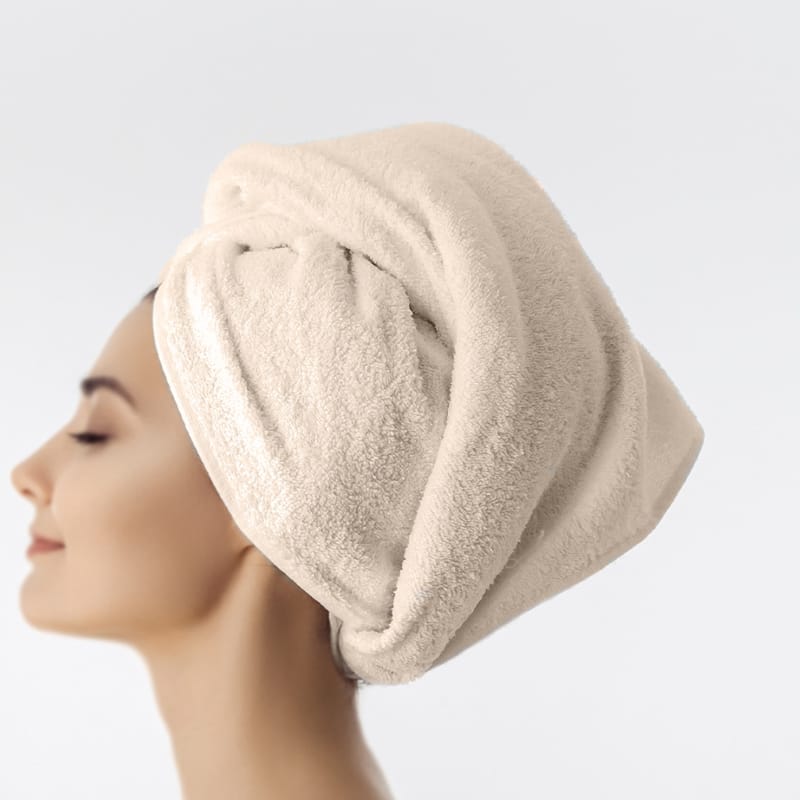 Each towel has a button at the front, and a tab at the end to be easily applied to the hair.