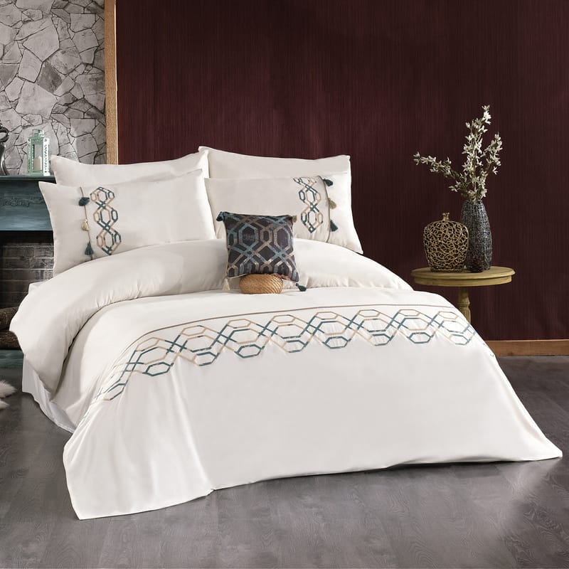 Bridal Duvet Cover - 7 pieces Size: King. Story: We realize the importance of special occasions at Karaz Linen, and the impact they leave in a person's mind, so we took care of the tiniest details, and we changed the concept of a bridal bedding set from a product that can be used only in special occasions, into a practical one, that you can use always, keeping the classical design, unique style and luxurious knitting. Specifications: 1 Duvet Cover 260 x 240 cm (Pure cotton, hand-embroidered with four inner fabric ties to fix the filling) 1 Fitted sheet 200 x 200 + 35 cm (Pure cotton) 2 Pillowcases 85 x 50 cm (Pure cotton) 2 Shams 85 x 50 cm (Pure cotton, hand-embroidered) 1 Decorative pillow 40 x 40 cm What is Jacquard weaving? Invented in 1801 by Joseph Jacquard, which enabled the weaving of complex patterns in silk. The Jacquard Loom is controlled by a chain of multiple cards punched with holes that determine which cords of the fabric warp should be raised for each pass of the shuttle. A loom of 400 hooks can be connected to four cords, giving a 1600-cord width canvas with four repetitions of the pattern across the canvas. It is a very complicated method, and it is hard to explain just by writing, but we tried to simplify it as much as possible. The Jacquard woven designs do not wrinkle after usage or washing, and they are very durable. Duvet cover features: 1- Can be washed in regular washing machine. 2- The inner filling can be easily installed and removed. Washing instructions: Please follow the washing instructions included with each item. Suggested product: Duvet from Karaz Linen. Made in India.