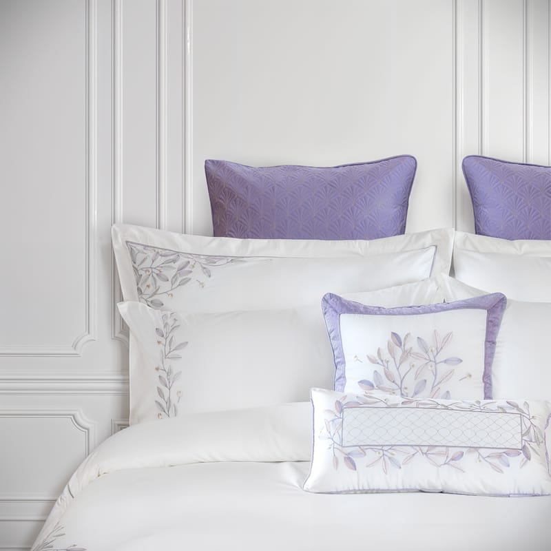 Hand embroidery in cool lavender and beige is skillfully crafted by the talented design team at Karez Linen.