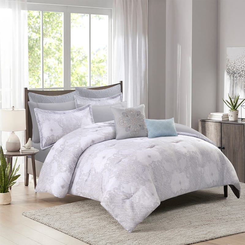 Size details: King size – 10 pieces: 1 Duvet 270 x 240 cm 1 Fitted sheet 200 x 200 + 40 cm 2 Pillowcases 90 x 50 cm 2 Shams 90 x 50 + 5 cm 2 Euro shams 65 x 65 cm 1 Decorative pillow 30 x 45 cm 1 Decorative pillow 45 x 45 cm